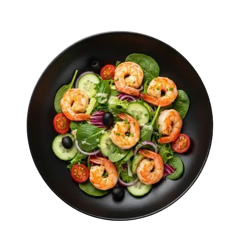 mit Eisbergsalat Tomaten Gurken gebratenen Champignons gebr. Garnelen Gurken Zwiebeln